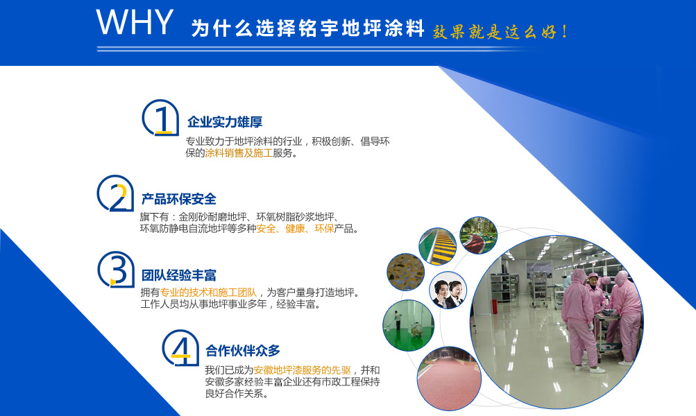 安徽銘宇建材科技有限公司是一家致力于地坪涂料的行業,旗下有金剛砂耐磨地坪,環氧樹脂砂漿地坪,環氧防靜電自流地坪,停車場防滑地坪,混凝土密封固化劑和丙烯酸球場,無震動止滑車道、塑膠跑道、工廠地板漆等工程施工服務。  憑借本身的技術能力和研發條件,加上多年對環氧地坪和耐磨硬化地坪等各類工業地坪的涂裝、施工的實踐經驗、技術己處于國內專業水平,經檢測機構檢驗符合相應的技術標準。同時安徽銘宇建材科技有限公司還組建了經驗豐富的工程技術隊伍以及工程施工隊伍、簡歷了完善的售后施工服務體系,滿足用戶的需要。   安徽銘宇建材科技有限公司是一家積極創新、倡導環保的涂料銷售及施工服務的廠家,安徽銘宇建材科技有限...